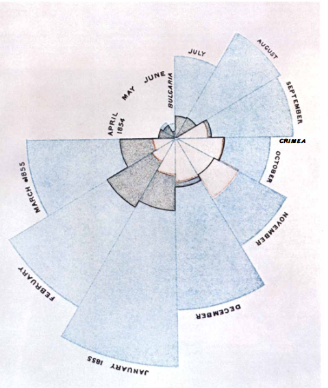 Florence foi uma pioneira na representação gráfica de estatísticas, inventando os diagramas de área polar para mostrar quantas mortes poderiam ter sido evitadas se essas medidas sanitárias tivessem sido tomadas antes. Abaixo está a figura original criado pela Florence: