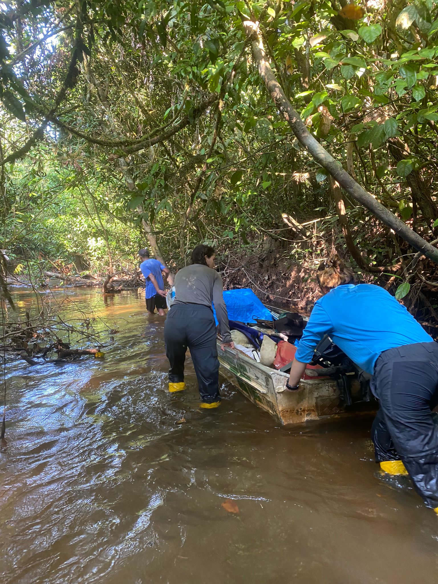 Durante esse tempo, essas e outras situações me levaram a perceber que uma mulher precisa fazer mais do que um homem para ser vista e admirada. Se fizer o mesmo, passa despercebida, e se fizer menos, é apenas o esperado. Houve, inclusive, uma situação em que fomos para uma área muito isolada, a Grade Uatumã. Para chegar lá, é preciso remar e empurrar o barco igarapé acima, além de caminhar muitos quilômetros para acessar a parcela. Nessa época, o igarapé estava tão seco que só conseguimos montar acampamento a 7 km da parcela, de modo que tínhamos que caminhar cerca de 14 km todos os dias, carregando os materiais apenas para ir e voltar do acampamento. No final de um dia de amostragem, após retornarmos ao acampamento, ainda tivemos que ouvir: “Vocês estão cansadas, né? Já é puxado para mim, que sou homem; imagina para vocês.”